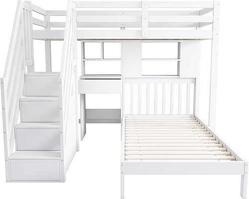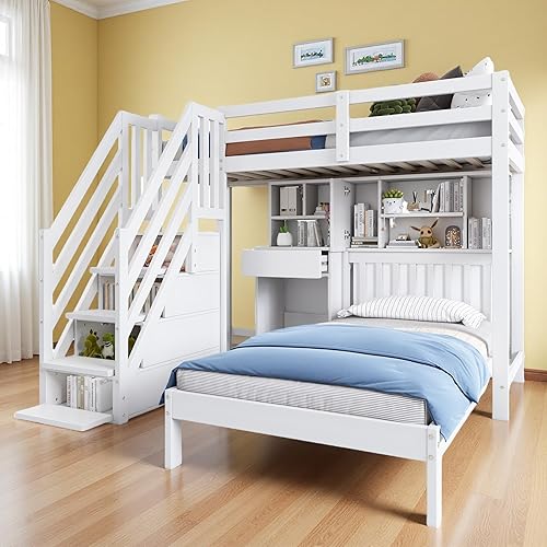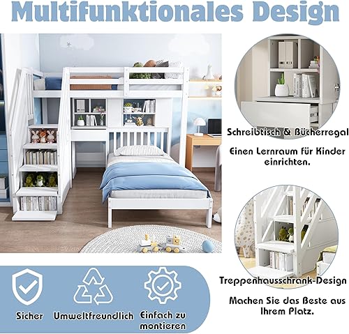 Lit superposé Enfant 90 x 200 avec Fonction Espace de Rangement,lit Double 90 x 200 Multifonction,lit Mezzanine 2 Places avec Bureau et étagères,pour Enfants 90 x 200