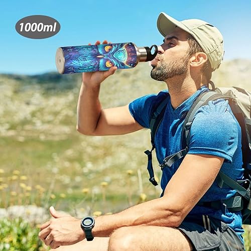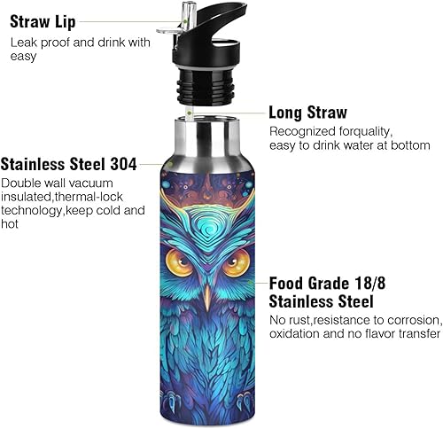 Fuauuyl Bouteille d'eau isotherme en acier inoxydable avec paille pour salle de sport, sport, plein air, motif hibou fluo (2) - 600 ml