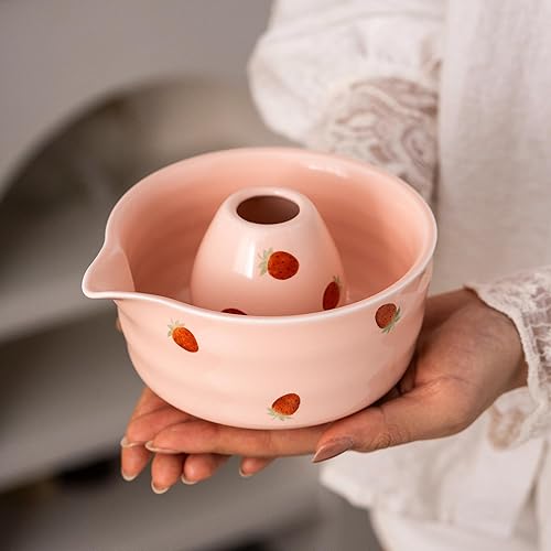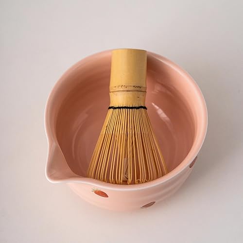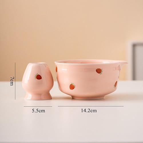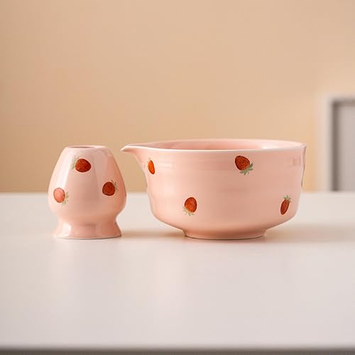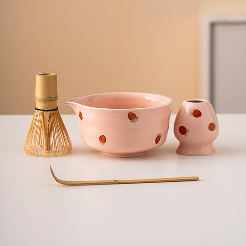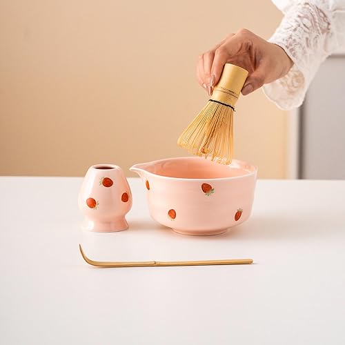 Ensemble de matcha japonais, kit de matcha en céramique fraise, ensemble de cérémonie rose macha bol à matcha et fouet, kit de fabrication de thé, coffret cadeau unique pour elle/femme/couple (4 pcs)