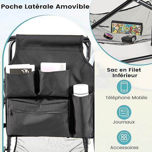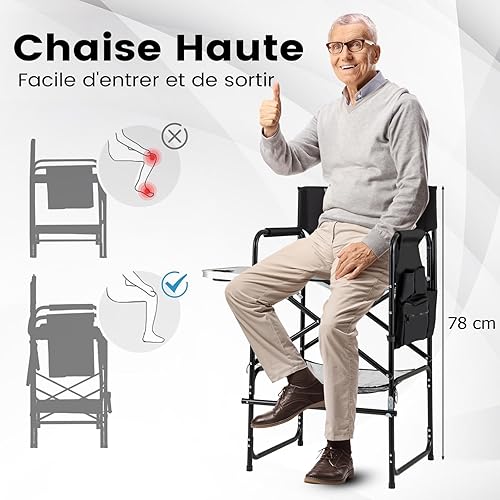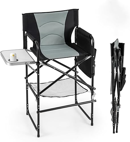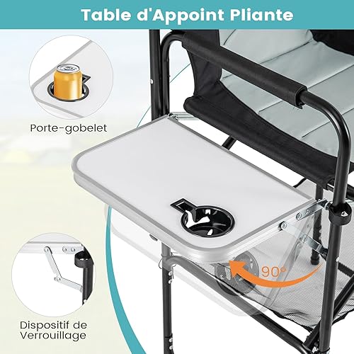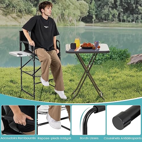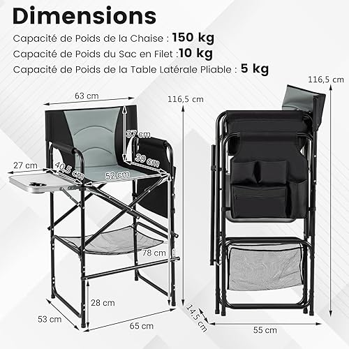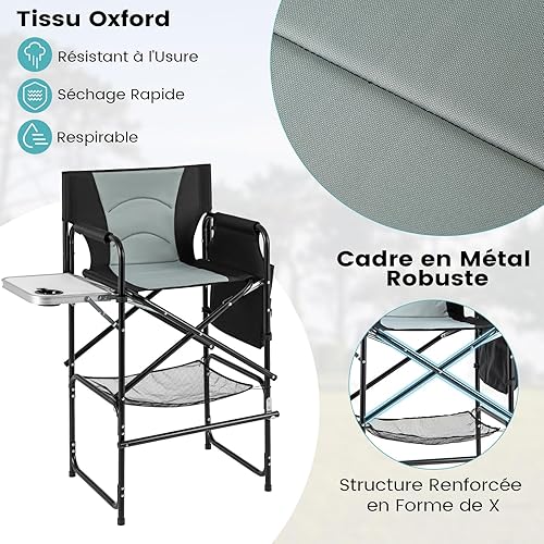 GYMAX Chaise Maquillage Professionnel 116,5 cm, Chaise Metteur en Scène Pliable Portable avec Plateau, Porte-Gobelet, Repose-Pieds, Sac en Filet, Poche de Rangement, Chaise Haute pour Studio