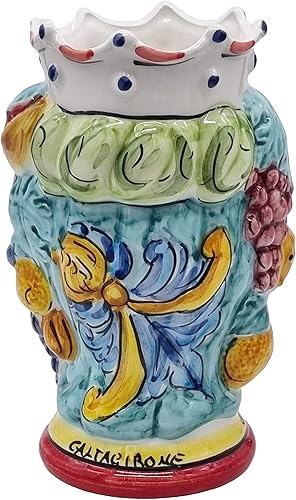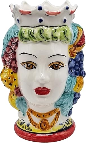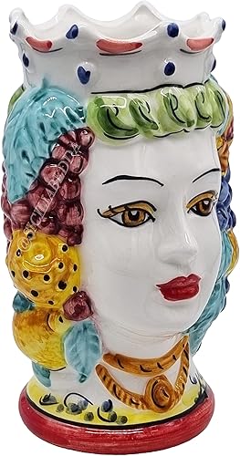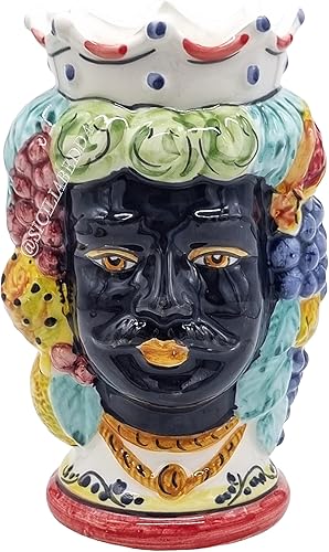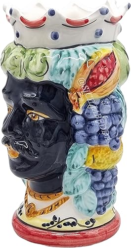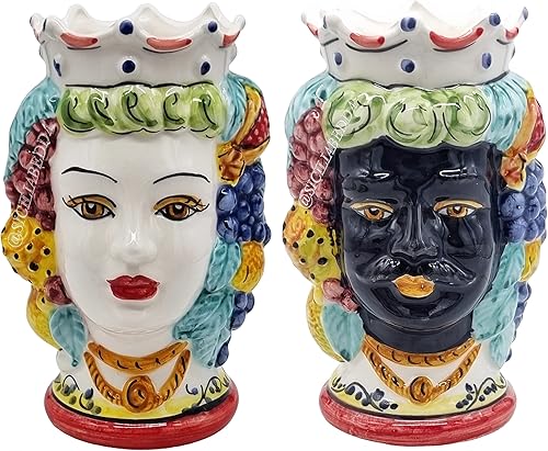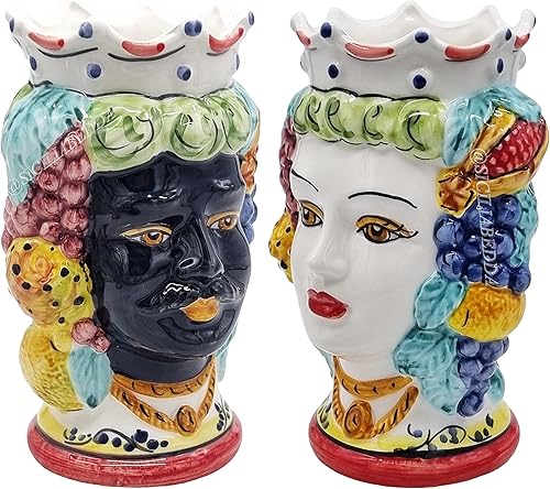 sicilia bedda - Paire de têtes de Moro SICILIENNES en céramique de CALTAGIRONE - Fabriquées à la main - H Centimètres 18 - Élégantes décoration (Couronne Rouge avec Sarrasin)