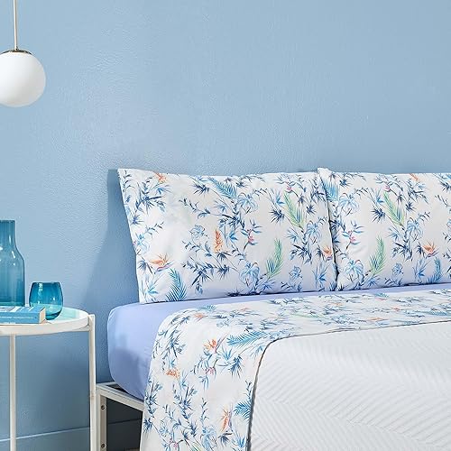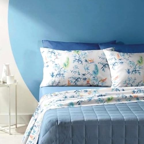 Zucchi Parure de lit 2 places 100 % percale de pur coton, drap housse avec coins + drap housse + 2 taies d'oreiller Art Puket couleur bleu clair B2