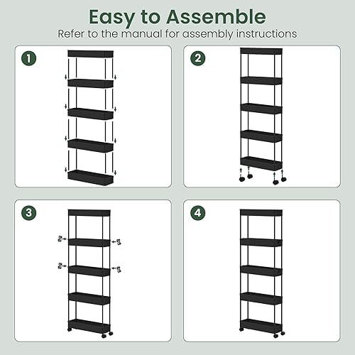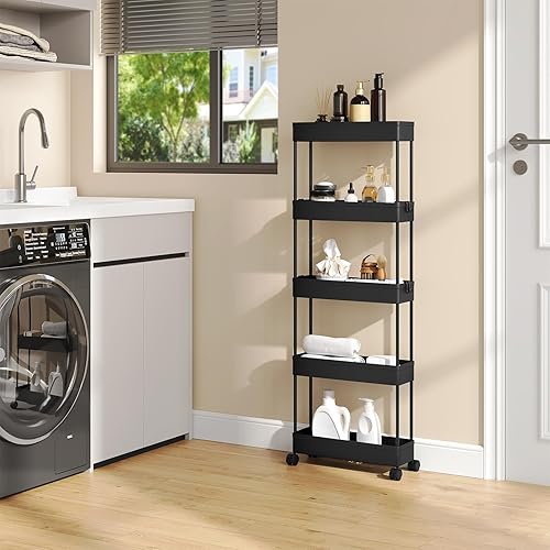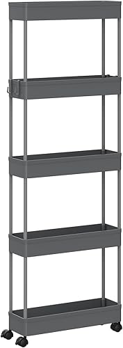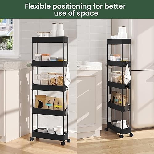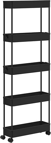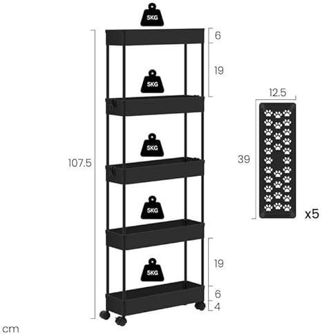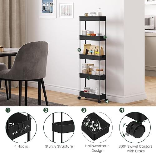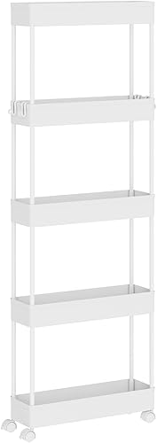 Klihome Chariot à roulettes, Chariot Étoite à 5 Niveaux, Étagère de Rangement Roulante avec 4 Crochets, pour Cuisine, Salle de Bain, 39x12,5x107,5 cm, Blanc