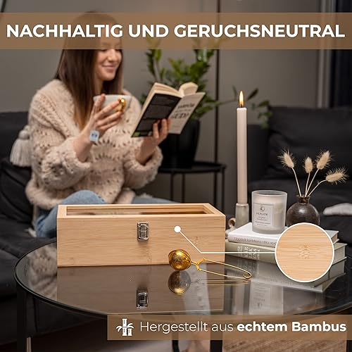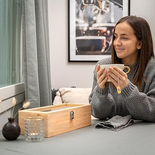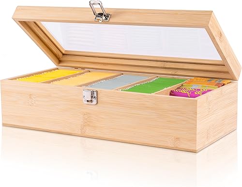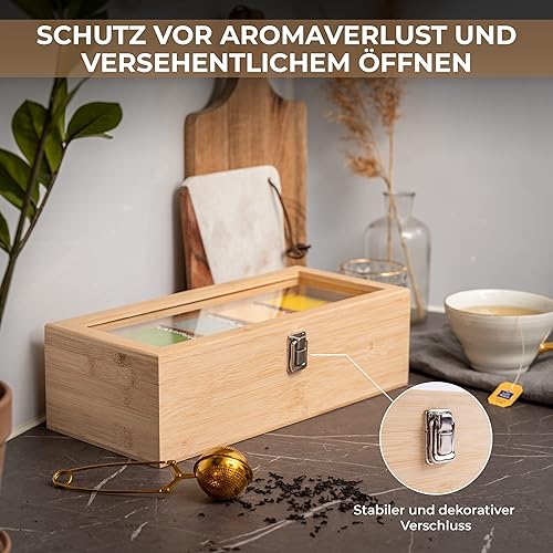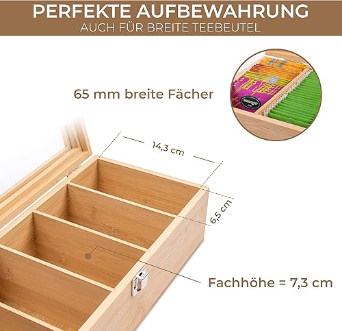 Valuna Boîte à thé en bambou H x l x P : env. 11 x 36 x 16 cm, boîte de rangement avec 5 compartiments, boîte à thé en bois pour ranger 100 sachets de thé
