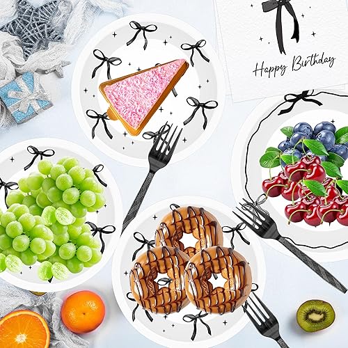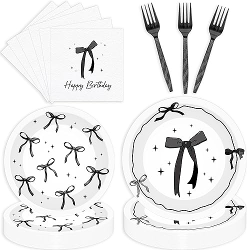 Lot de 96 décorations d'anniversaire avec nœud noir pour 24 invités avec assiettes, serviettes, fourchettes, fournitures de fête d'anniversaire pour filles et femmes