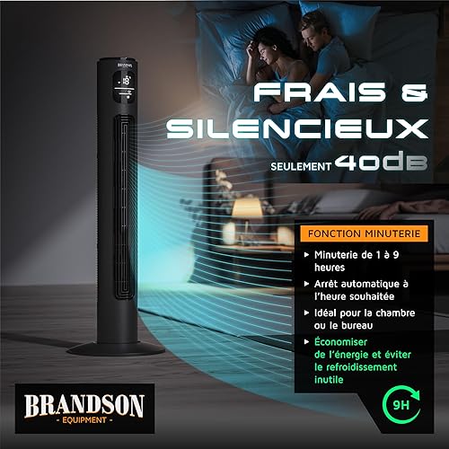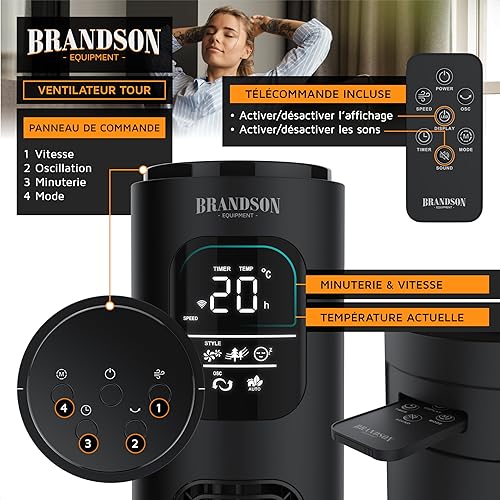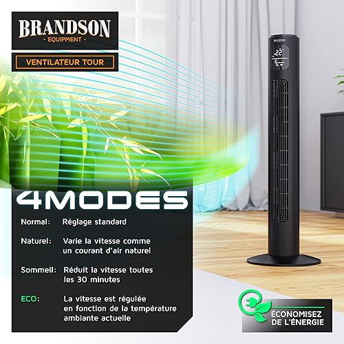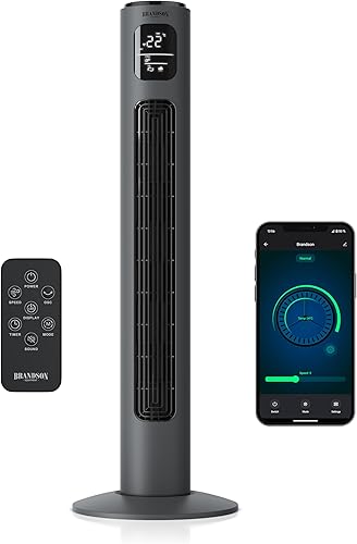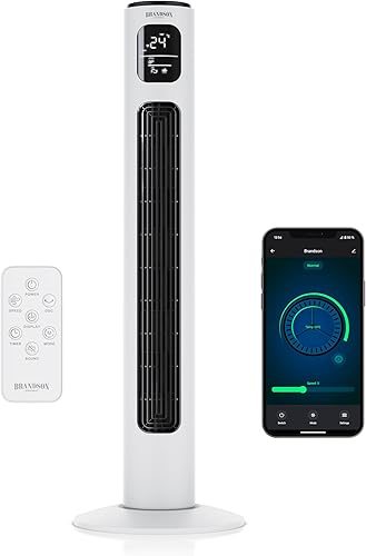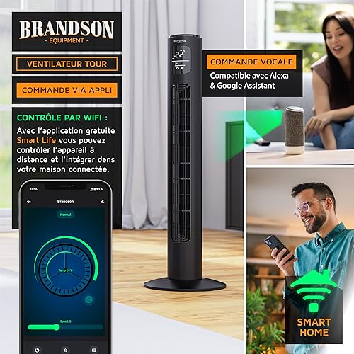 Brandson Premium Ventilateur Colonne ECO avec moteur DC 35 Watt – extrêmement silencieux – commande par appli – commande vocale – grand écran LED – incl. télécommande – minuterie – 4 modes
