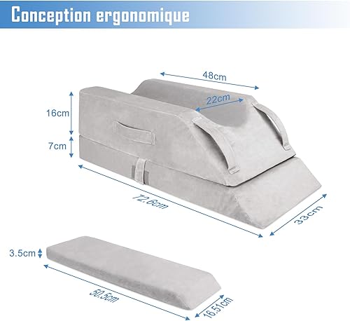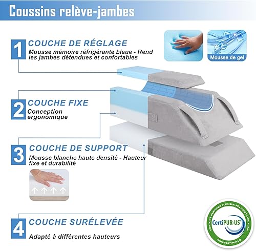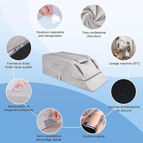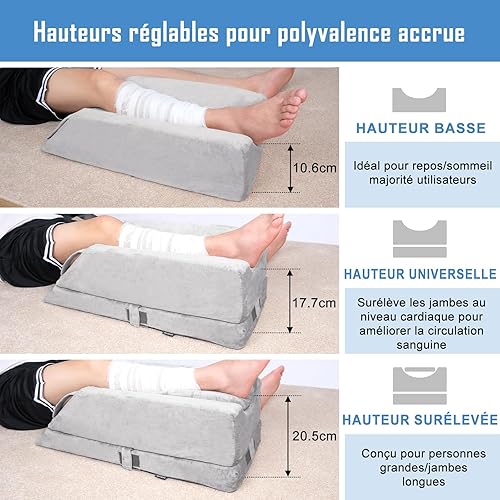 Coussins Relève-Jambes réglable en 4 hauteurs, Idéal après une Chirurgie, pour Blessures ou Détente, Mousse Mémoire Orthopédique, Doté de 3 Poignées et d'un Insert Amovible, Housse en Velours Lavable