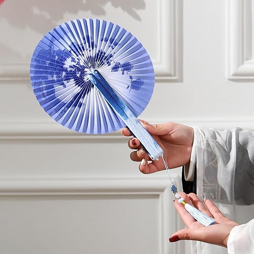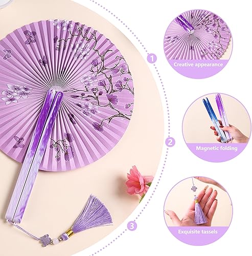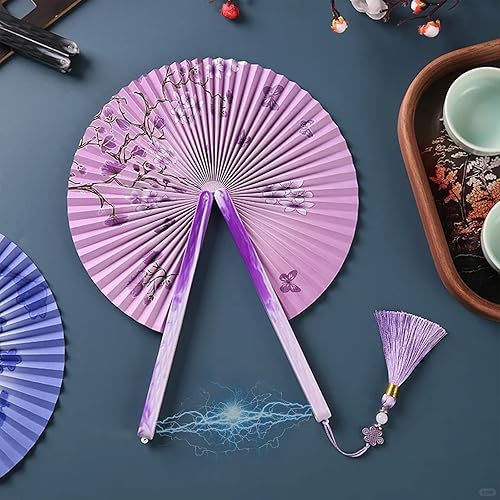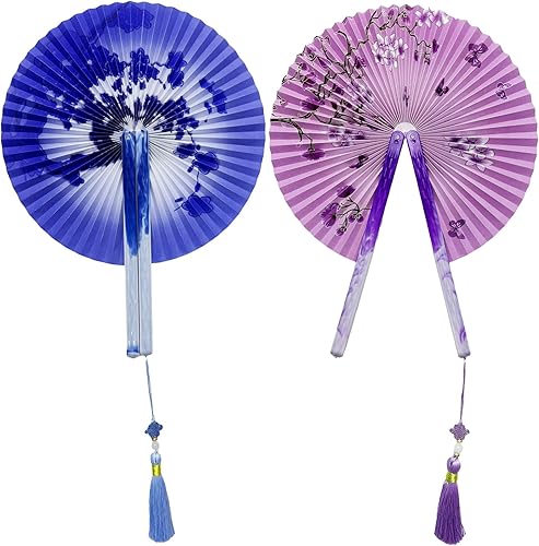 XIAQICA 2 PCS Magnétique Éventails Pliants Rétro Round Ventilateur à Main Pliable Eventail Papier Eventail Mariage avec Frange Style Chinois pour Mariage Danse Fête Performance(Violet,Bleu)