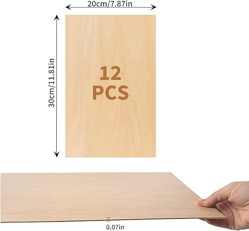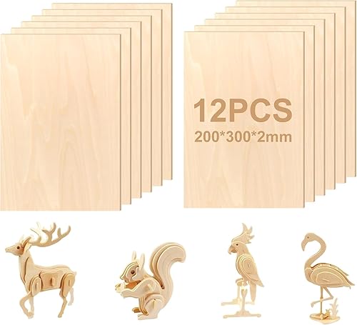 Lot de 12 plaques de contreplaqué - 300 x 200 x 2 mm - En bois de tilleul naturel non fini - Plaques en bois de balsa - Pour gravure, projets en bois et gravure, projets de bricolage