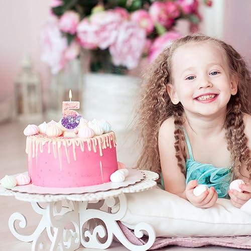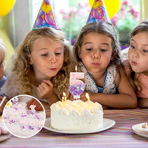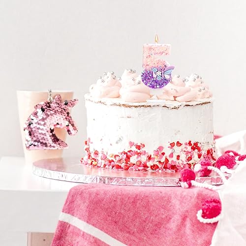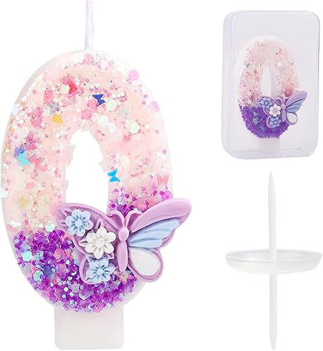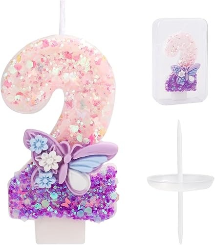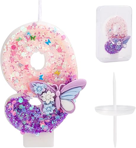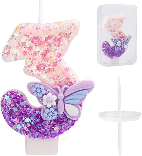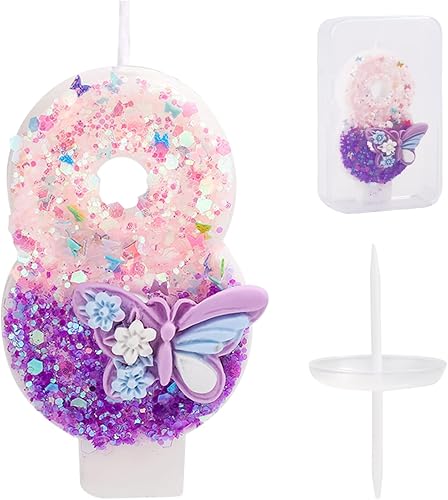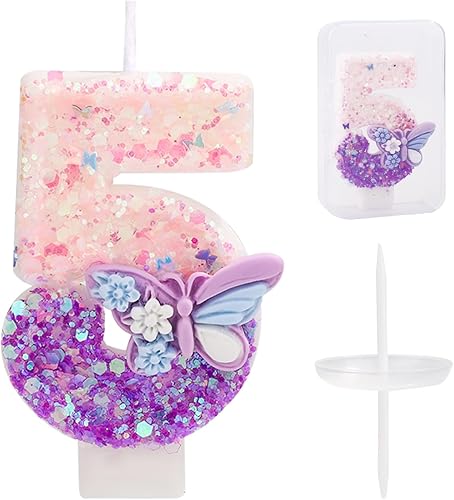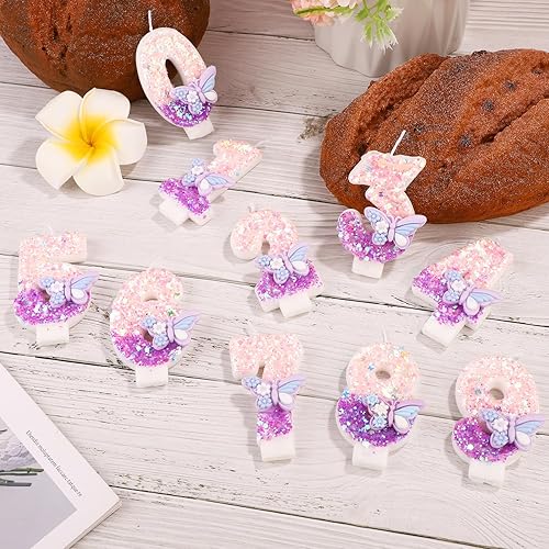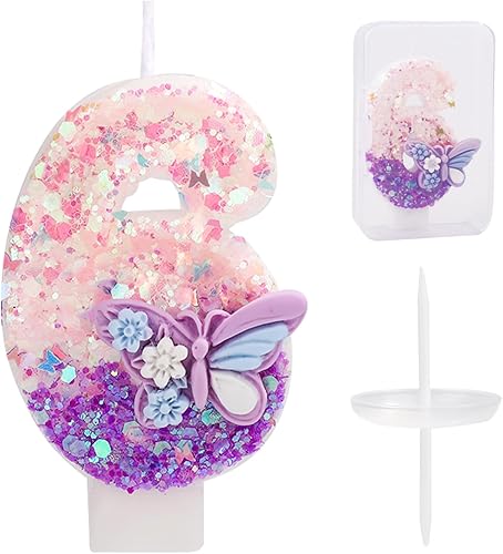 Bougie Numéro d'Anniversaire, Bougie d'Anniversaire à Paillettes Papillon Rose et Violet avec Décoration de Gâteau Paillettes pour Filles Femmes Fournitures de Fête d'Anniversaire (Numéro 6)