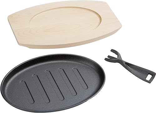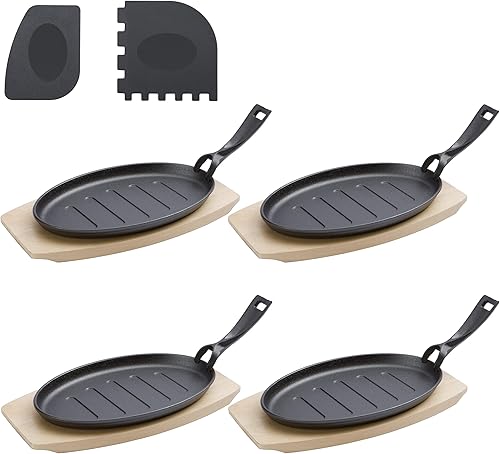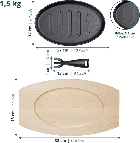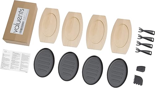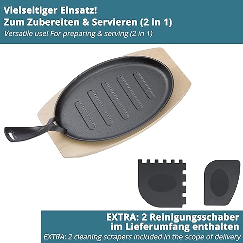 valuents mini poêle en fonte de 27cm – poele grill avec plat pour servir en bois 32cm – set de 4 plaques en fonte +Plus : 2 racloirs