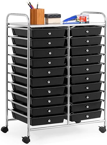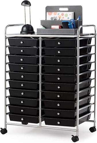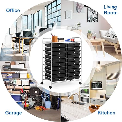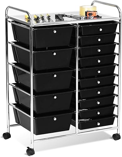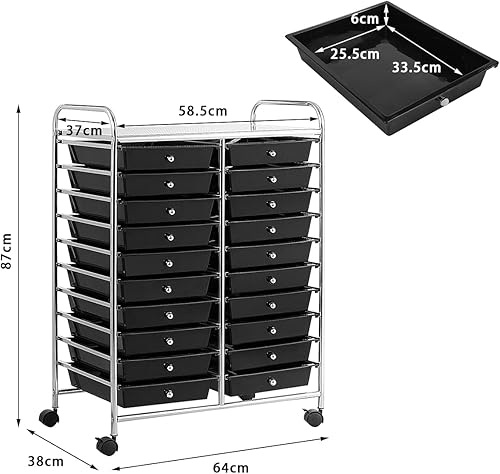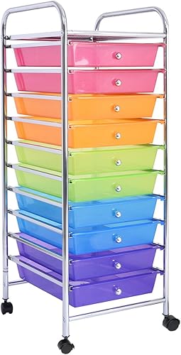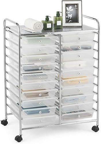 RELAX4LIFE Chariot de Rangement avec 15 Multi-tiroirs en PP et Cadre en Métal, Rayonnage de Rangement à roulettes avec 2 Freins pour Bureau, Salon, Chambre (10 étagères avec 15 tiroirs, Clair)