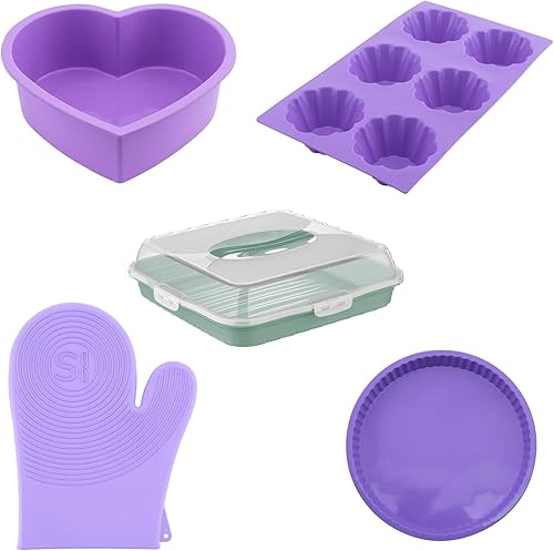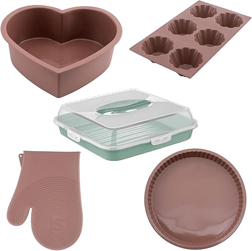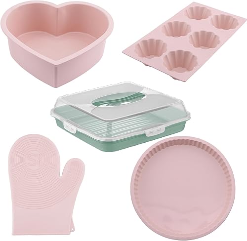 Ensemble de Cuisine en Silicone 5 pièces – Moule en Forme de Cœur, Moule à Tarte Classique, Moule 6 Cavités pour Muffins, Mitaines de Four Chef et Boîte de Transport pour Gâteau - Écologique