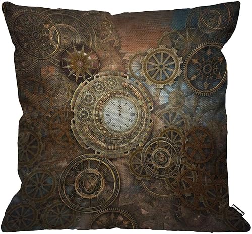 HGOD DESIGNS Housse de coussin steampunk steampunk rouillée avec horloge et différents engrenages en métal doré bronze pour salon, chambre à coucher, canapé, chaise, taie d'oreiller 45 x 45 cm