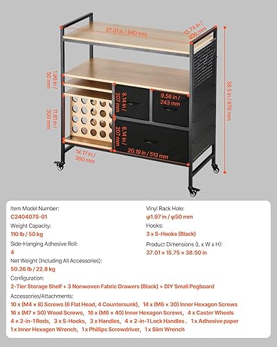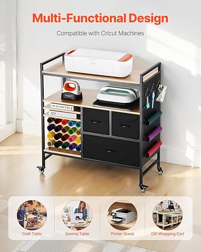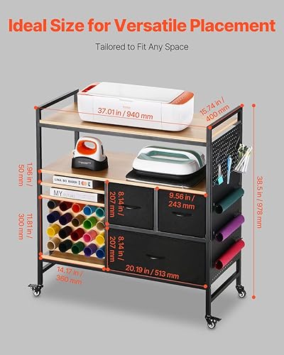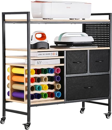 VEVOR Chariot de Rangement, Compatible avec Les Plotters de Découpe, Table de Travail Artisanal avec 20 Porte-Rouleaux de Vinyle et 3 Tiroirs, Poste de Travail avec Roues, pour Salle d’Artisanat