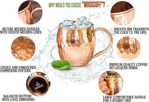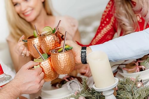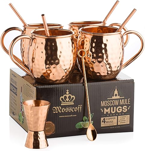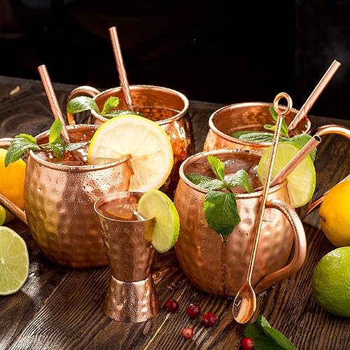 Ensemble de 4 tasses en cuivre mule de Moscou - jigger en cuivre, pailles en cuivre torsadées, cuillère en cuivre avec tasses en cuivre 4x16 oz.