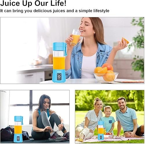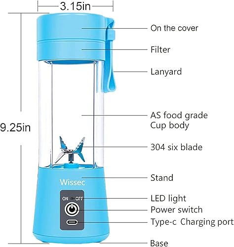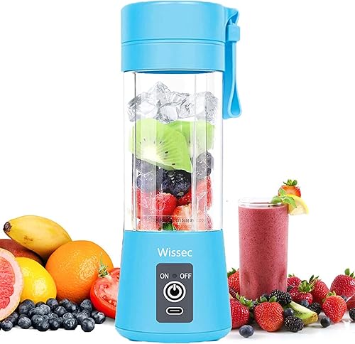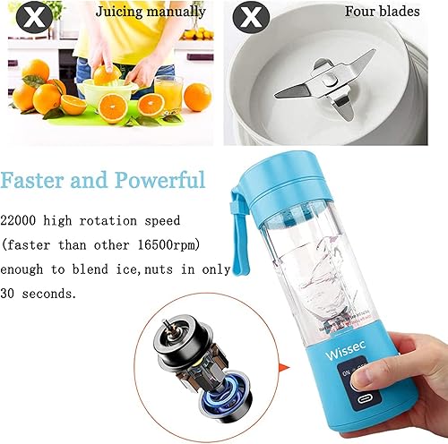 Wissec Portable Mixeur,Mini Blender Pour Smoothie Bleu,Adapté Aux Smoothies et Milk-shake,Blender Portable de Fruits électrique,Chargement USB, Six Lames 3D Pour un Excellent Mixage,380 ml,Sans BPA