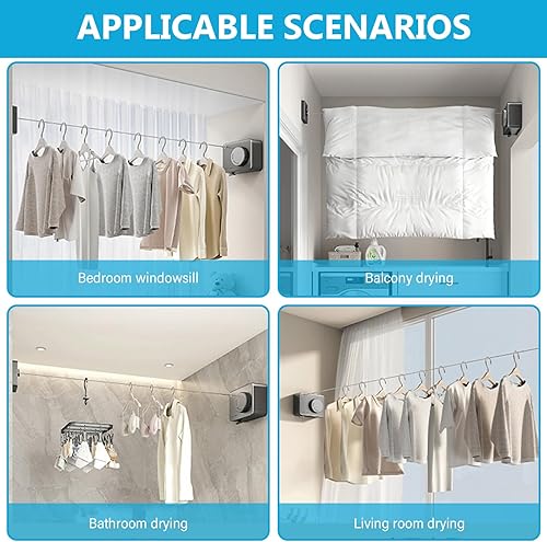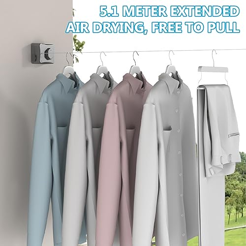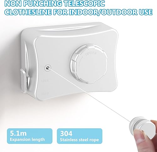 TOATELU Corde à linge extensible - 5,1 m - Extensible - Montage mural - Avec corde en acier inoxydable - Poids de stockage : 20 kg - Empêche l'affaissement (blanc)