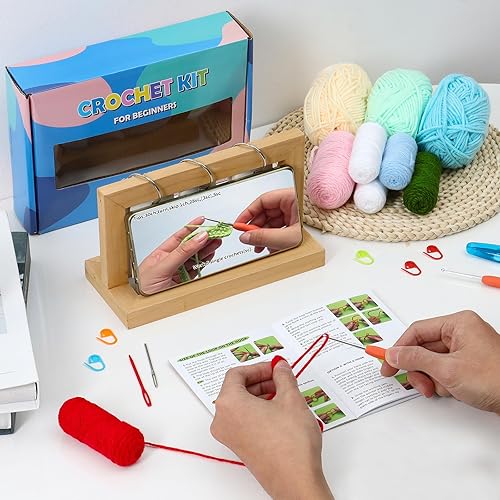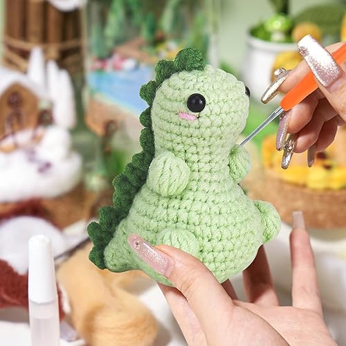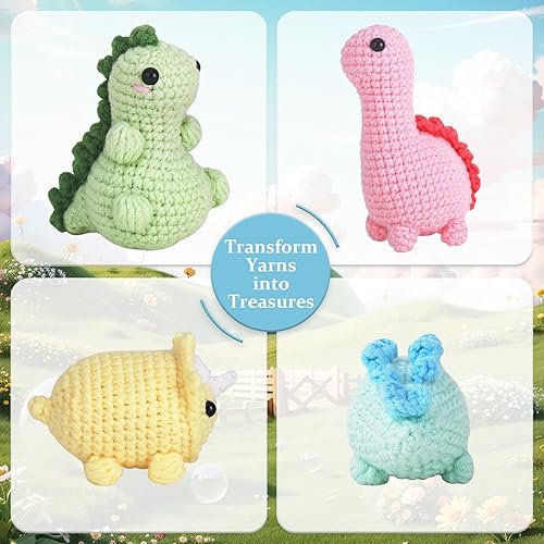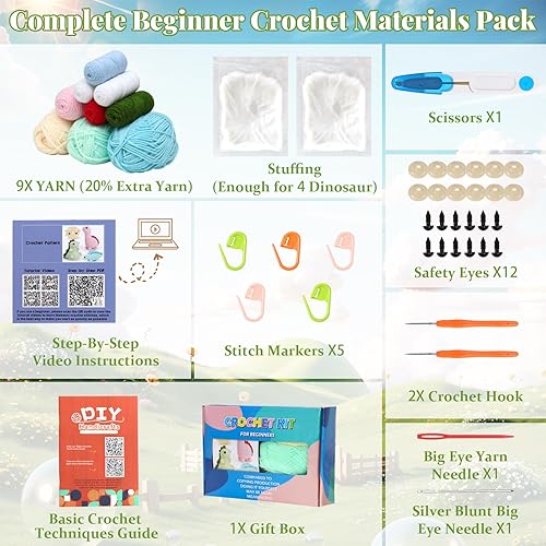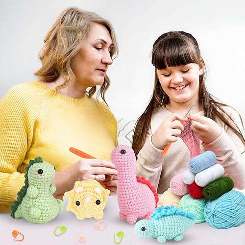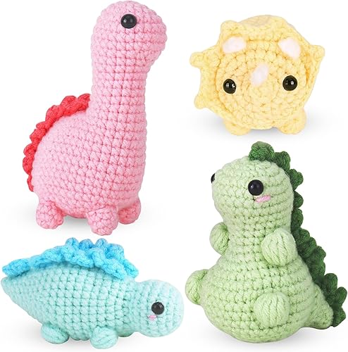 Dremisland Kit de crochet pour débutants - Lot de 4 kits de démarrage au crochet dinosaure pour adultes - Kit d'aiguilles à tricoter - Fournitures de tricot - Cadeau avec instructions étape par étape