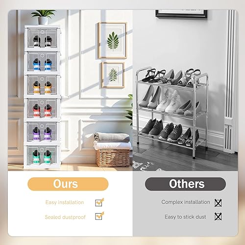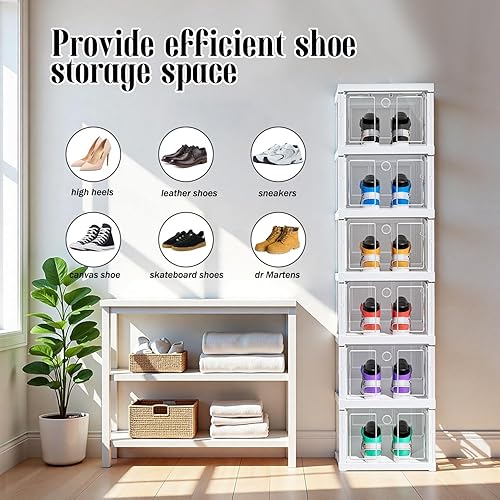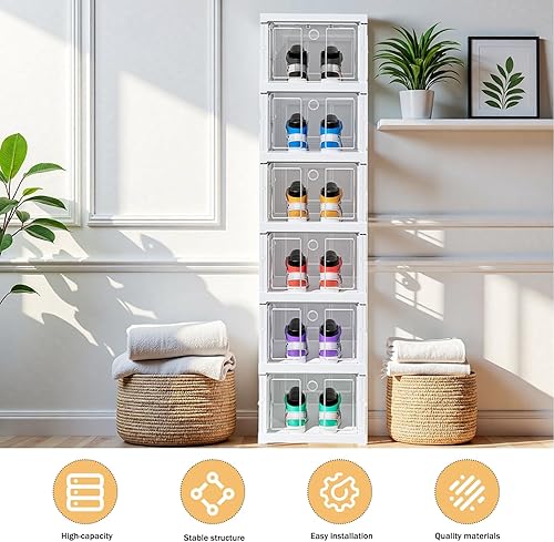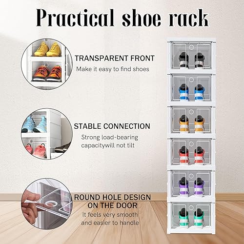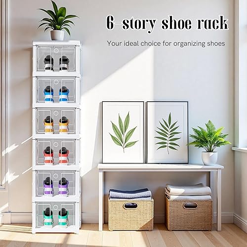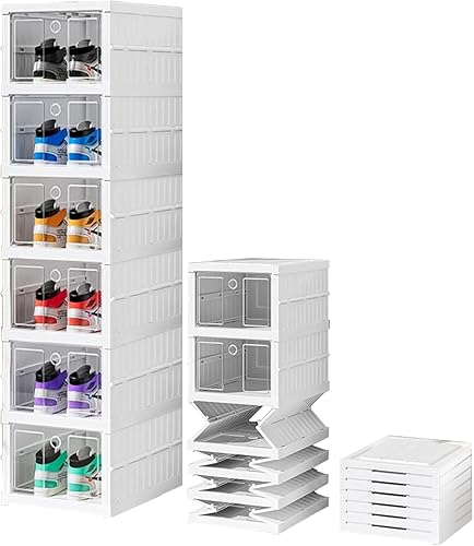 Boîtes à chaussures transparentes empilables, lot de 6 organisateurs empilables pour chaussures, rangement pliable et portable, jusqu'à taille 46, montage facile, transparent et blanc