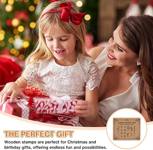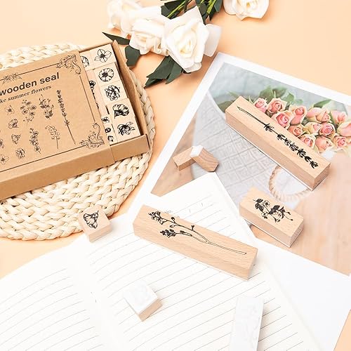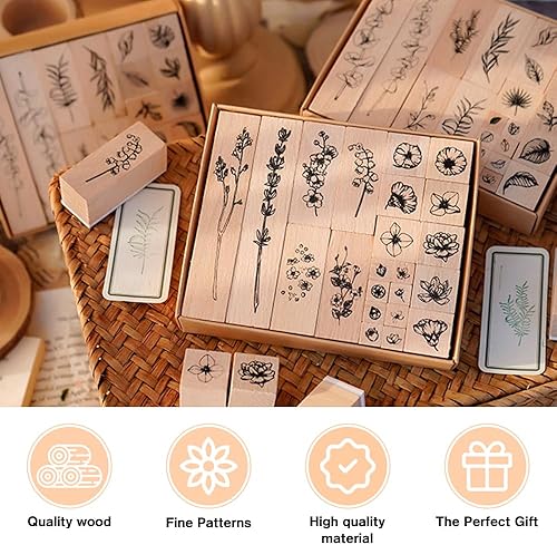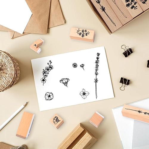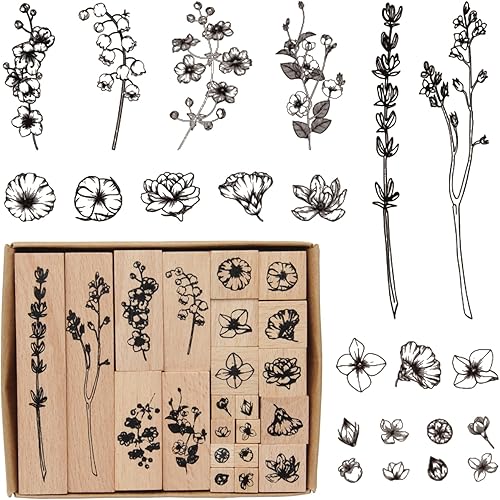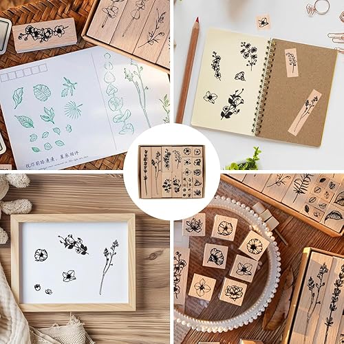 UTMACH 22 Pièces Tampon Bois Plante, Jeu de Tampons Caoutchouc en Boîte, Naturelle Fleur Scrapbooking pour Dessins, Lettres, Cartes, Albums DIY