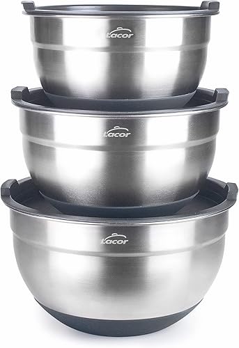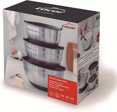 Lacor - 60050 - Lot de 3 bols en acier inoxydable, bols, saladiers, contenants alimentaires, comprend des couvercles, empilables, Dimensions: 16 cm (1,5 L), 18 cm (2,2 L) et 20 cm (3 L)