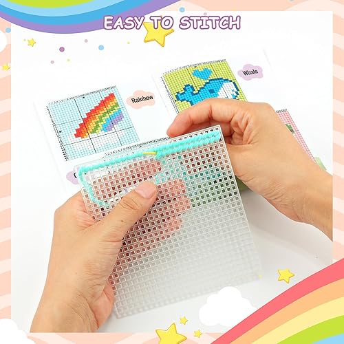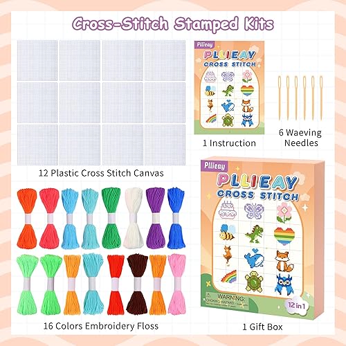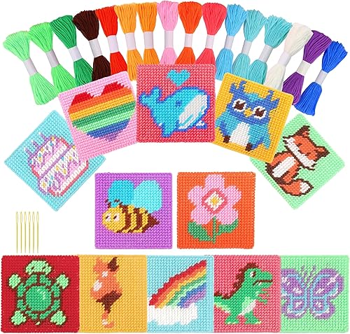 Pllieay Point de Croix Enfant 12-en-1 pour Enfants, Kit de Broderie Comprenant 12 Toiles en Plastique Vides, 16 Fils, 6 Aiguilles à Broder, Kit de Couture de Débutant avec Instructions