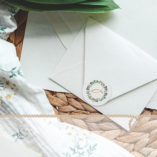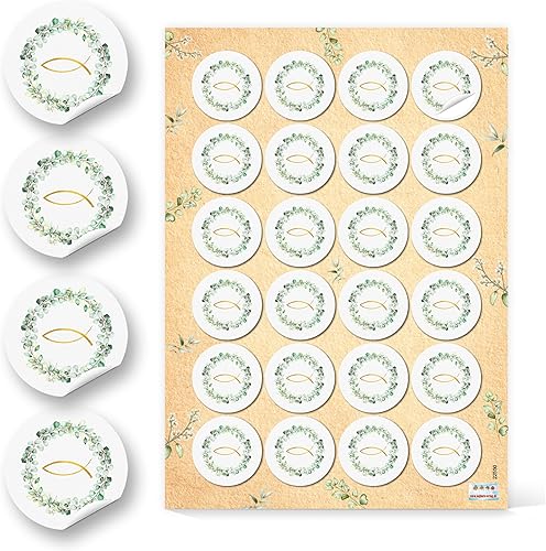 Autocollants communion et baptême, Lot de 24: Stickers ronds avec eucalyptus et poisson doré, pour décoration baptême, confirmation ou mariage, cartes, cadeaux et scrapbooking, vert & or, Ø 4 cm