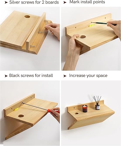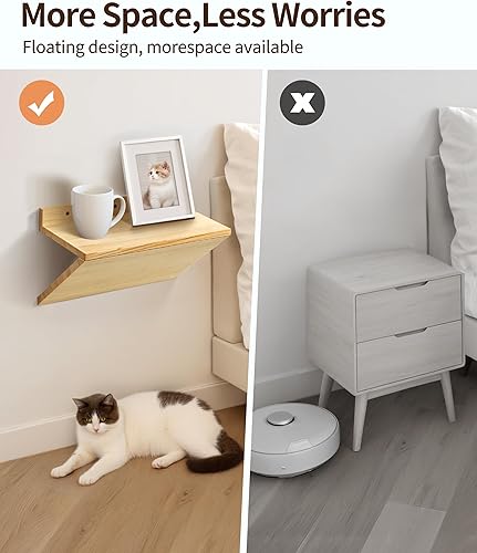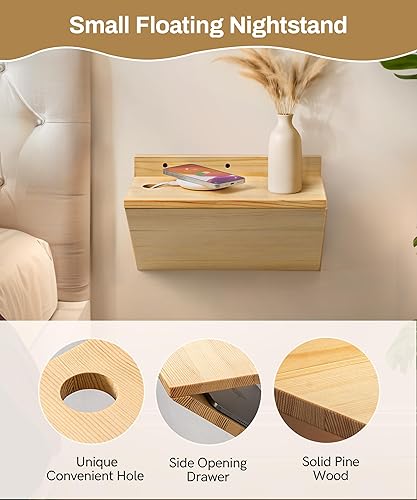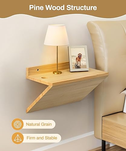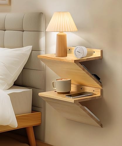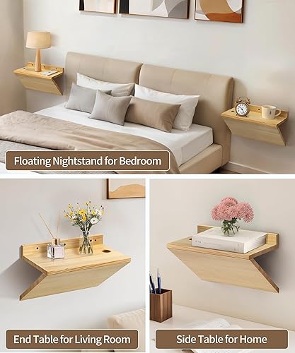 Mazjoaru Lot de 2 petites tables de chevet flottantes avec trou de câble, table de chevet flottante en bois naturel avec design en forme de Z, meubles de présentation pour chambre à coucher