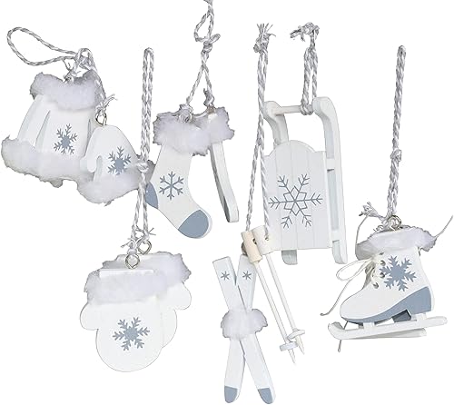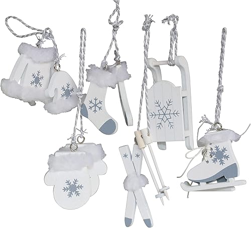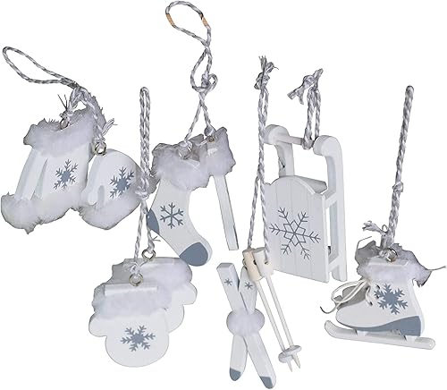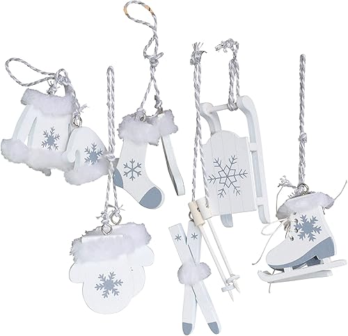 Lot de 6 décorations de Noël en bois blanc - Patins à glace - Ski - Luge - OTH - Décoration d'arbre nostalgique - Alpes - Décoration d'hiver - Décoration en bois