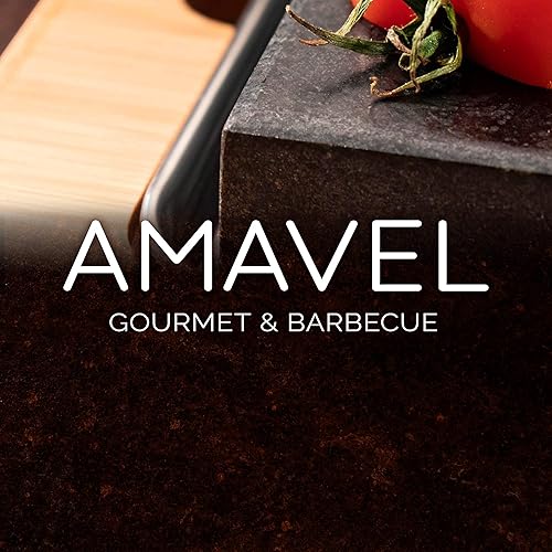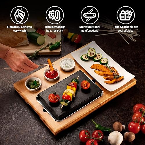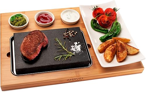 AMAVEL Planche avec Pierre de Lave, Set de 7 Pièces avec 3 Coupelles et 1 Assiette, Pierre à Griller pour Viande et Poisson, Cuisson Sans Graisse