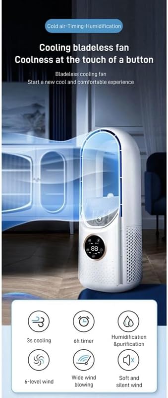 Ventilateurs colonne avec purificateur d'air, Ventilateur Colonne Sans Pale avec Lumière LED, 6 Vitesses, Tactile, Minuterie 6H, Effet Spray, Ventilateur Tour Silencieux pour Maison et Bureau (Blanc)