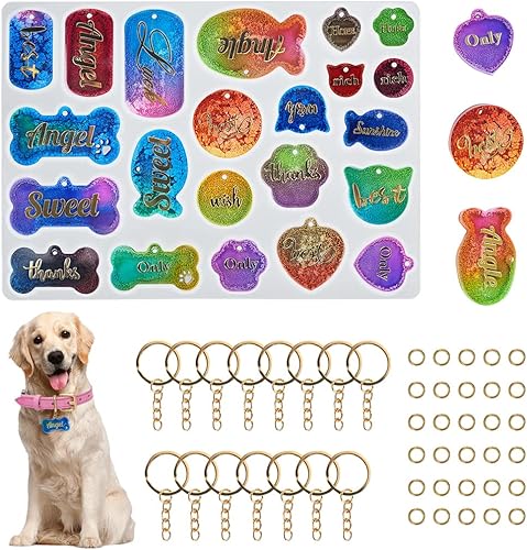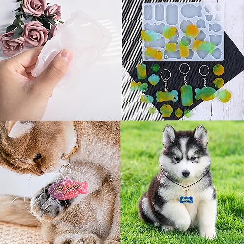KyeeaDIY Moule Resine Epoxy en Forme d'os de chien Porte-clés Charmes Moule Silicone Pendentif Chien Moulle Bijoux Resine Epoxy Moule Rectangulaire avec Trous Rond Cat/Dog Tag Resin Molds
