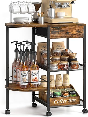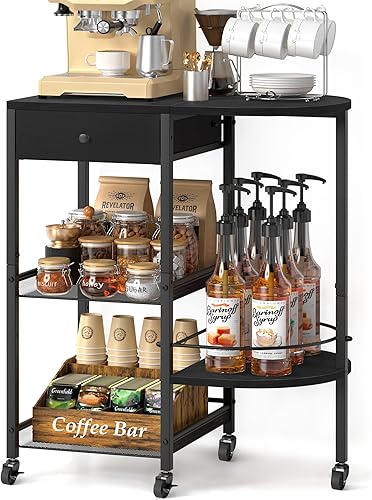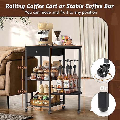 VINCOURNA Station à café, chariot de bar à café avec tiroir de rangement de 39 cm (l) – Grand chariot à café à 4 niveaux – Meuble de bar pour cuisine, bureau, salon – Noir