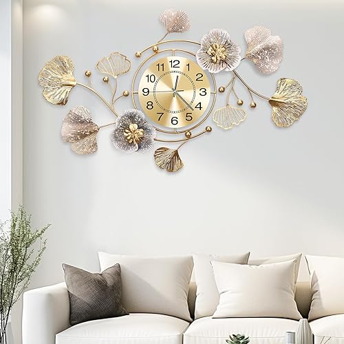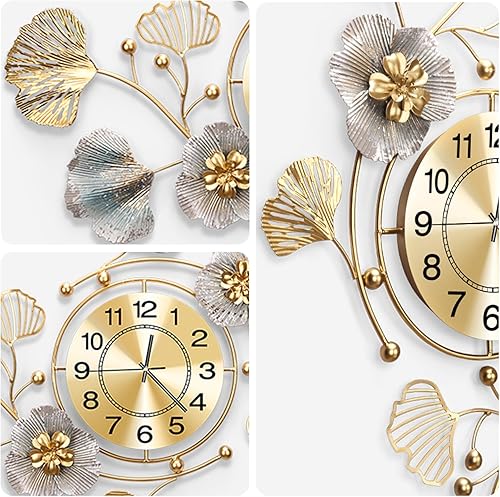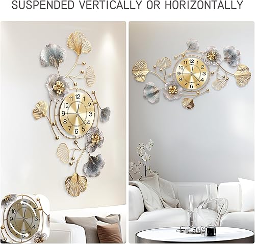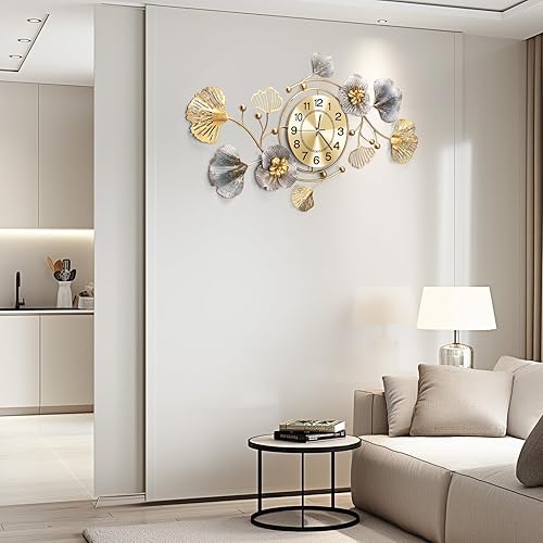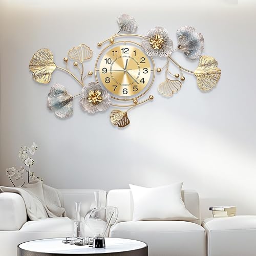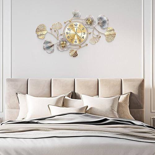 Blissio 2025 Grande horloge murale, horloge murale, design silencieux, design de feuilles Ginkgo en métal rétro, pour salon et cuisine, décoration murale (bleu rétro - arabe, 120 cm)