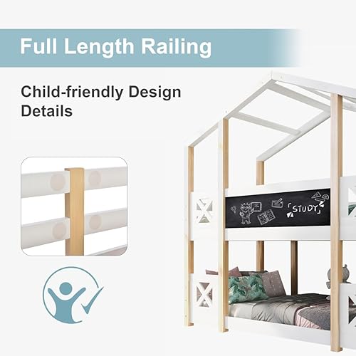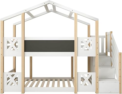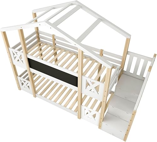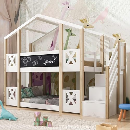 Lit superposé 90 x 200 cm, lit Enfant cabane dans l'arbre avec Rangement escalier et Protection Contre Les Chutes, Cadre de lit Enfant loft