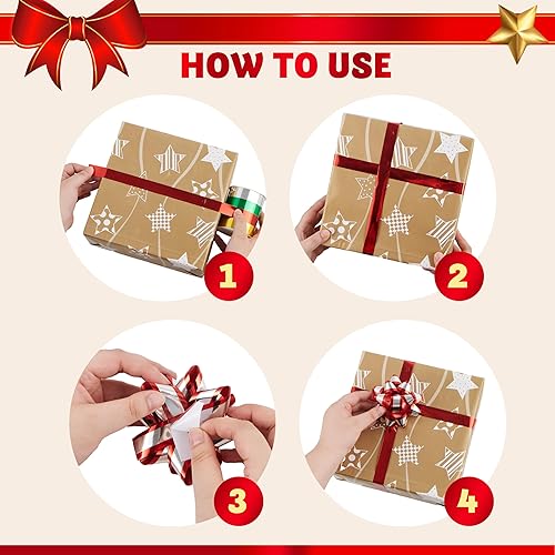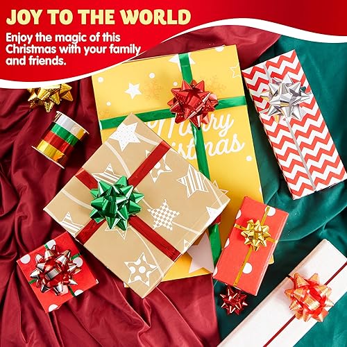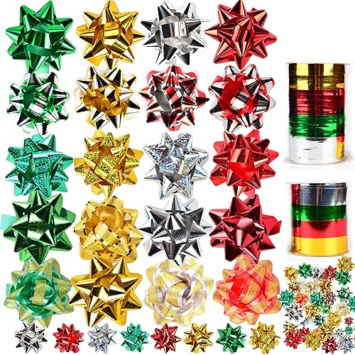 JOYIN 54 pcs de noeuds et rubans de Noël avec 46 noeuds autocollants multicolores et 8 rouleaux de rubans bouclés pour la décoration des cadeaux et des emballages.