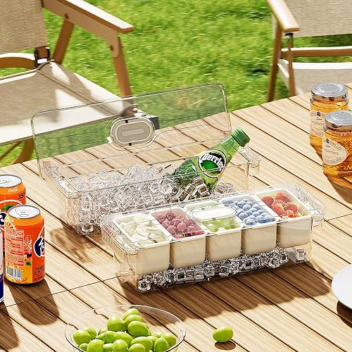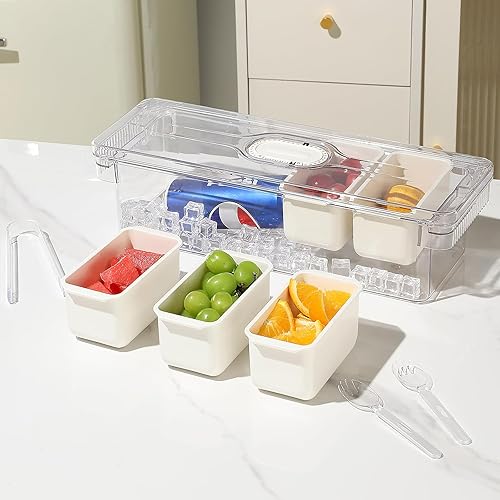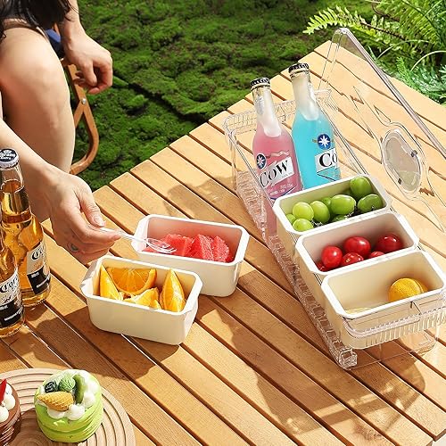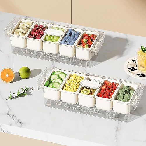 Fangoo Serveur de Condiments Rangement avec Couvercl 5 Compartiments Amovibles Conteneur 5 fourchetts et 2 pincese Plateau de service avec plats amovibles pour accessoires de bar, fruits, salade
