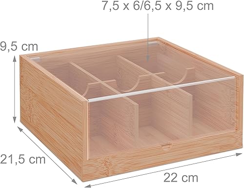 Relaxdays Boîte à thé, 6 Compartiments, en Bambou, fenêtre Transparente, HLP : 9,5 x 22 x 21,5 cm, Nature