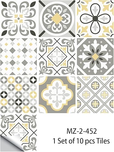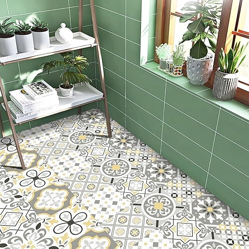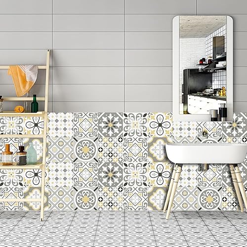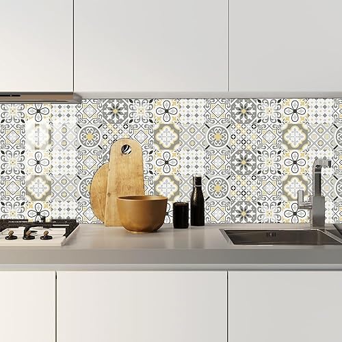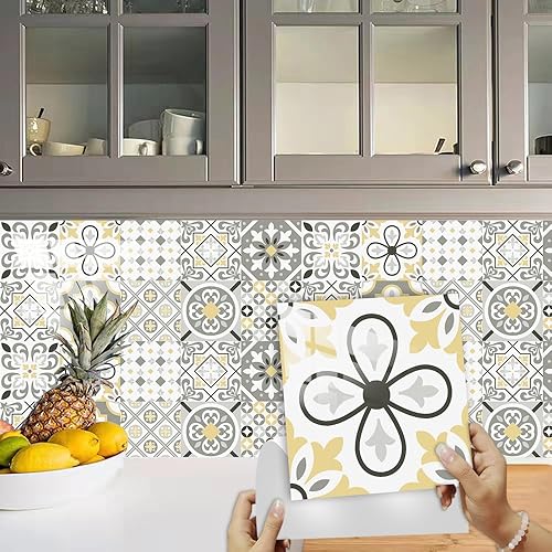 Stickers Muraux Cuisine Fleur Grise Jaune Credence Adhesive pour Cuisine Meuble Carrelage Adhesif Mural Salle de Bain Décor Dalle pvc Adhesive Sol Stickers Carrelage 15x15cm /10 pièces