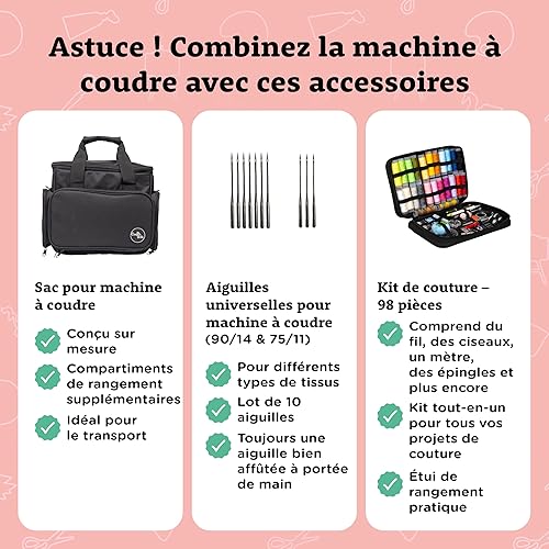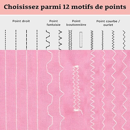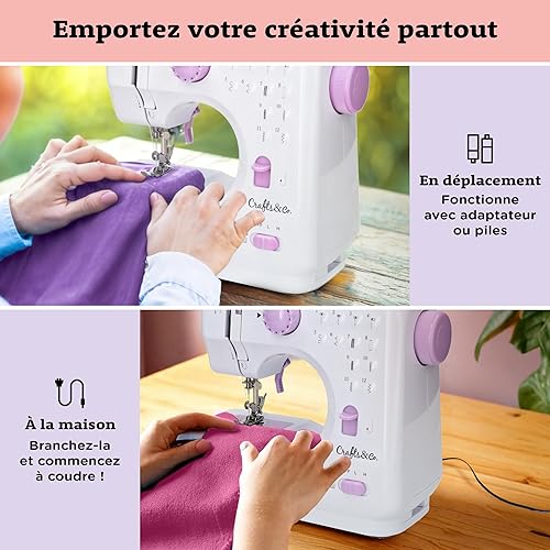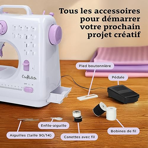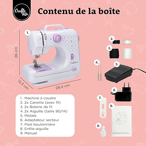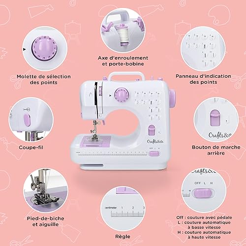 Crafts&Co® Machine à coudre pour débutants avec lumière LED intégrée et pédale | 12 points | Mini machine à coudre avec surjet | Singer | Pfaff | Blanc-Violet