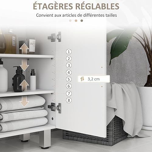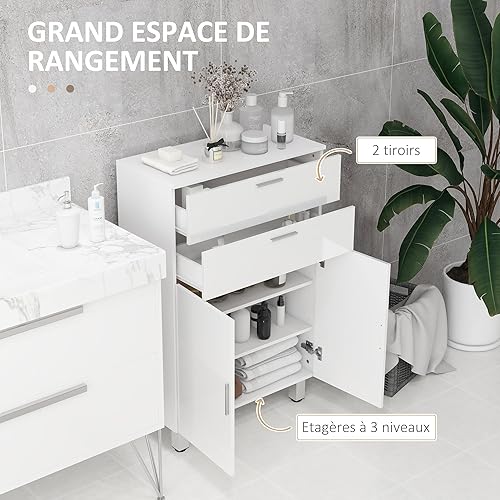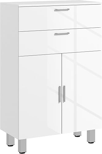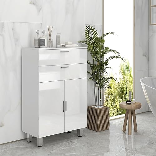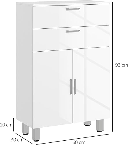 kleankin Meuble de Salle de Bain, Meuble de Rangement avec 2 tiroirs, Placard à Double Porte, étagères réglables et Base surélevée, Armoire Salle de Bain, Salon, Chambre, 60x30x93cm, Blanc Brillant