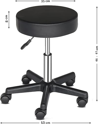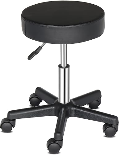 Bonnlo Tabouret à roulettes Réglable en Hauteur, Tabouret de Bureau avec Rembourrage de 10 cm, Tabouret de Travail Pivotant à 360°, Tabouret Rotatif pour Bureau/Salon/Bar, Cuir Synthétique, Noir