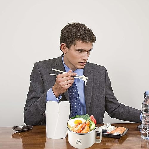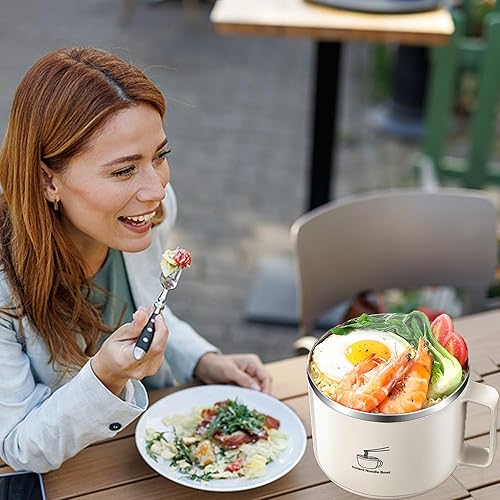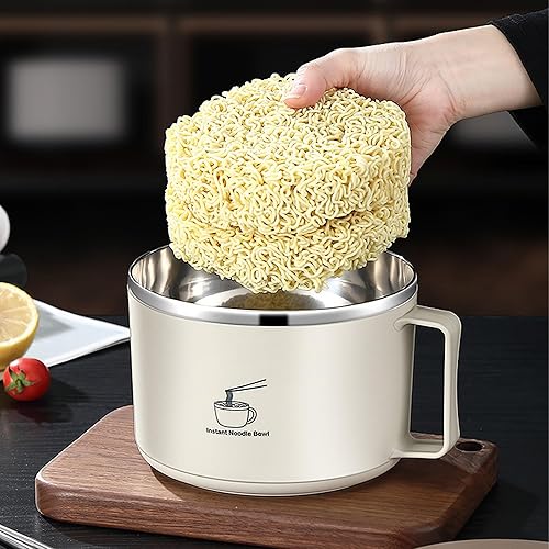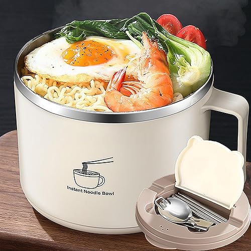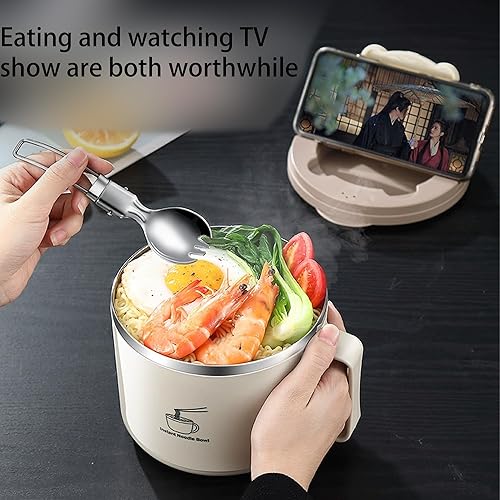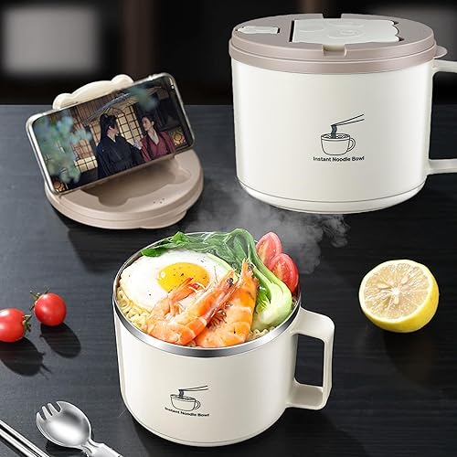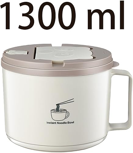 QSLKI 1300ml Bol de Nouilles Instantanées avec Poignées, Couverts Cachés, Ramen Rapide de avec Couvercle Filtrable, Nouilles Instantanées Petit-Déjeuner, Soupe avec Manche