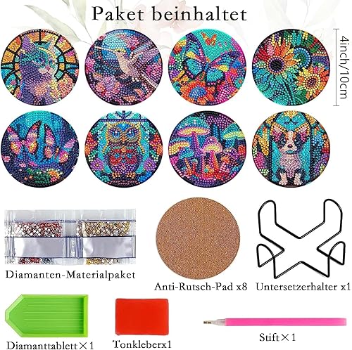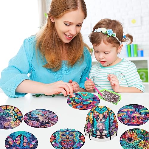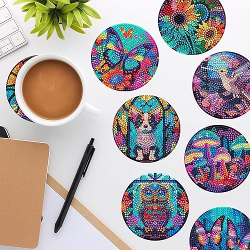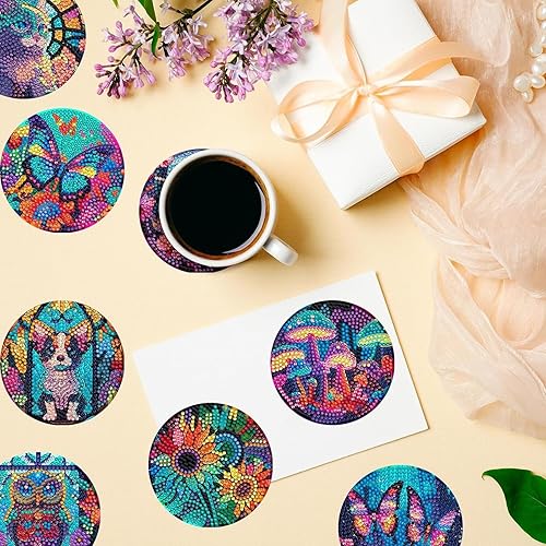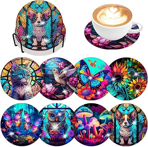 8 Pièces Diamond Painting Dessous de Verre,Dessous de Verre de Peinture Diamant avec Support Dessous de Verre Adultes Kits de Peinture de Diamond Painting sous-Verres avec Support