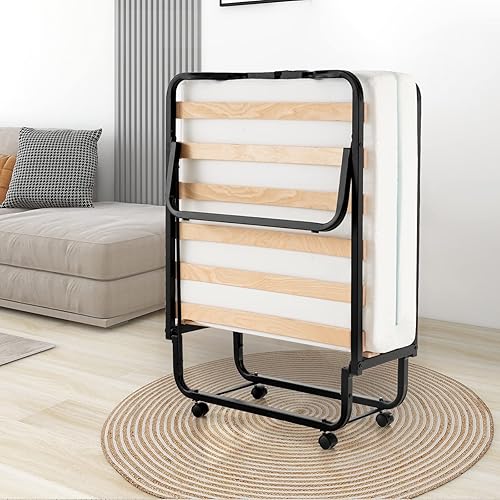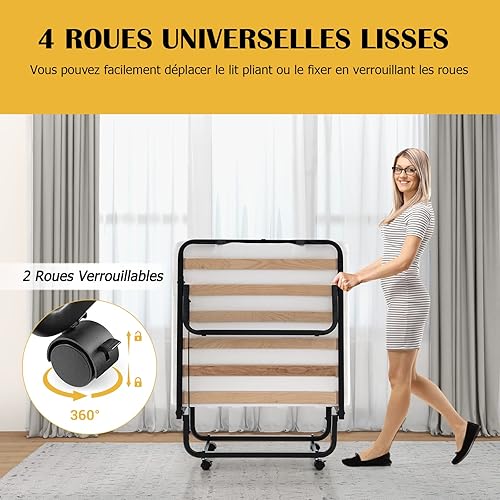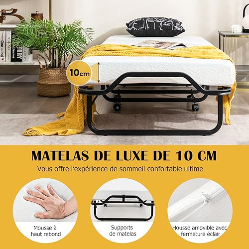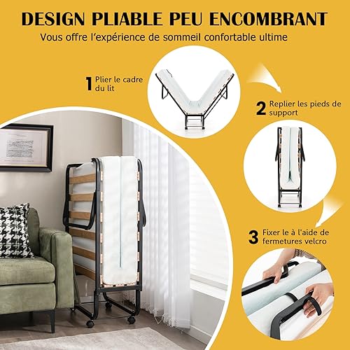 COSTWAY Lit Pliant 1 Personne Adulte 78 x 199 cm, avec Matelas Orthopédique en Mémoire 10 cm, Charge 220 kg, Lit d’Appoint Pliable à 4 roulettes et Sommier à 15 Lattes de Bois pour invités, Blanc