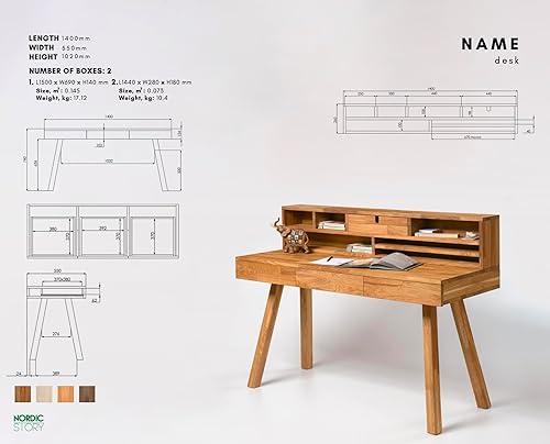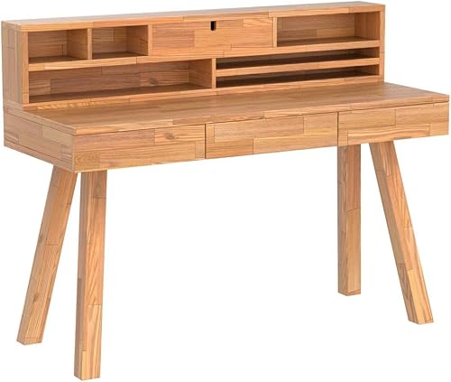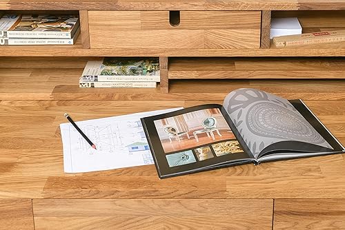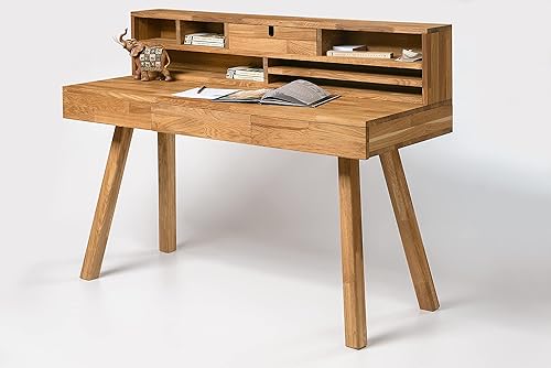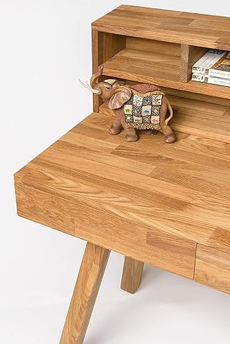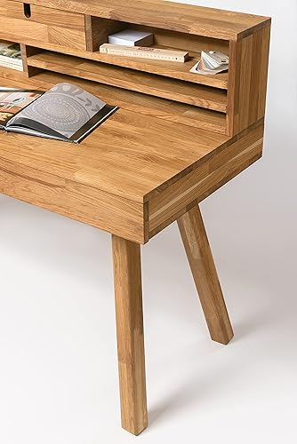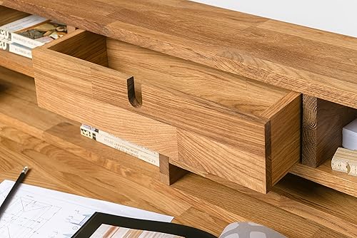 Nordic Story Table de bureau Studio avec 3 tiroirs et étagère flottante en bois massif chêne idéal pour ordinateur de bureau, meubles style nordique moderne 140 x 55 x 106 cm (chêne naturel)