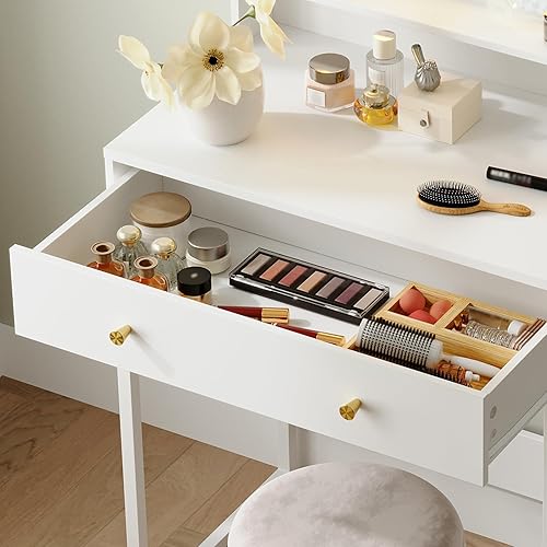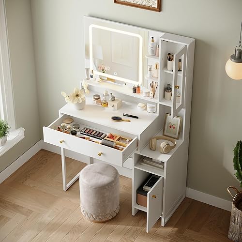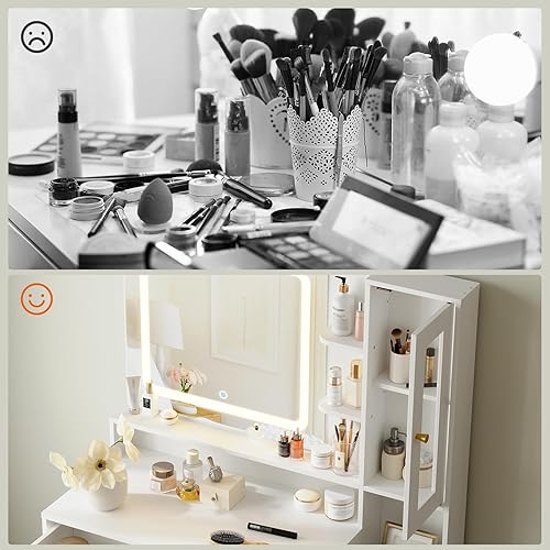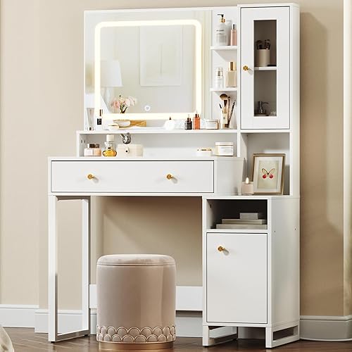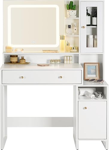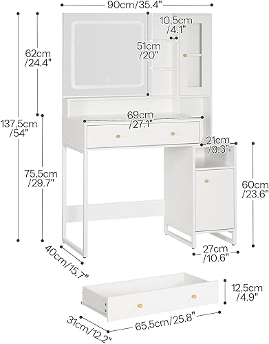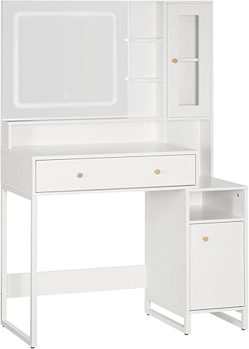 HOOBRO Coiffeuse avec Miroir LED, 3 températures de Couleur, Table de Maquillage avec tiroir, étagères, vitrine, Moderne et épurée, Cadre métallique, pour Chambre, Blanc EWT90DSZ01