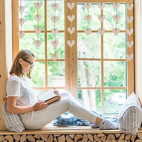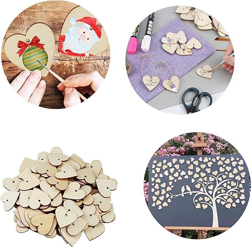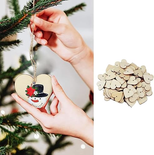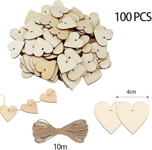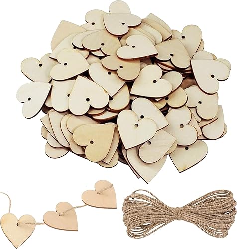 Lot de 100 Coeur en Bois avec Trous Bois Naturel en Forme de Coeur avec 10 m de Ficelle Naturelle Décorations pour Mariages, Fêtes,Cadeaux, Loisirs et Arts