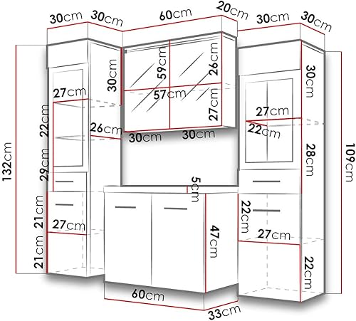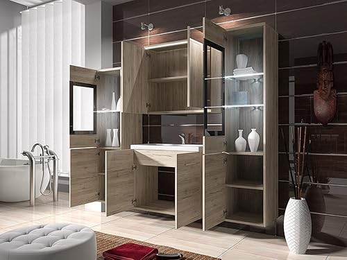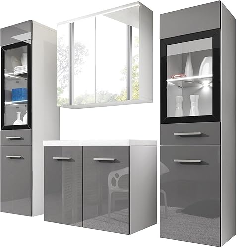 Udine II Ensemble de meubles de salle de bain avec lavabo et siphon, salle de bain moderne, armoire à miroir, lavabo, meuble haut (avec éclairage LED blanc, gris brillant)